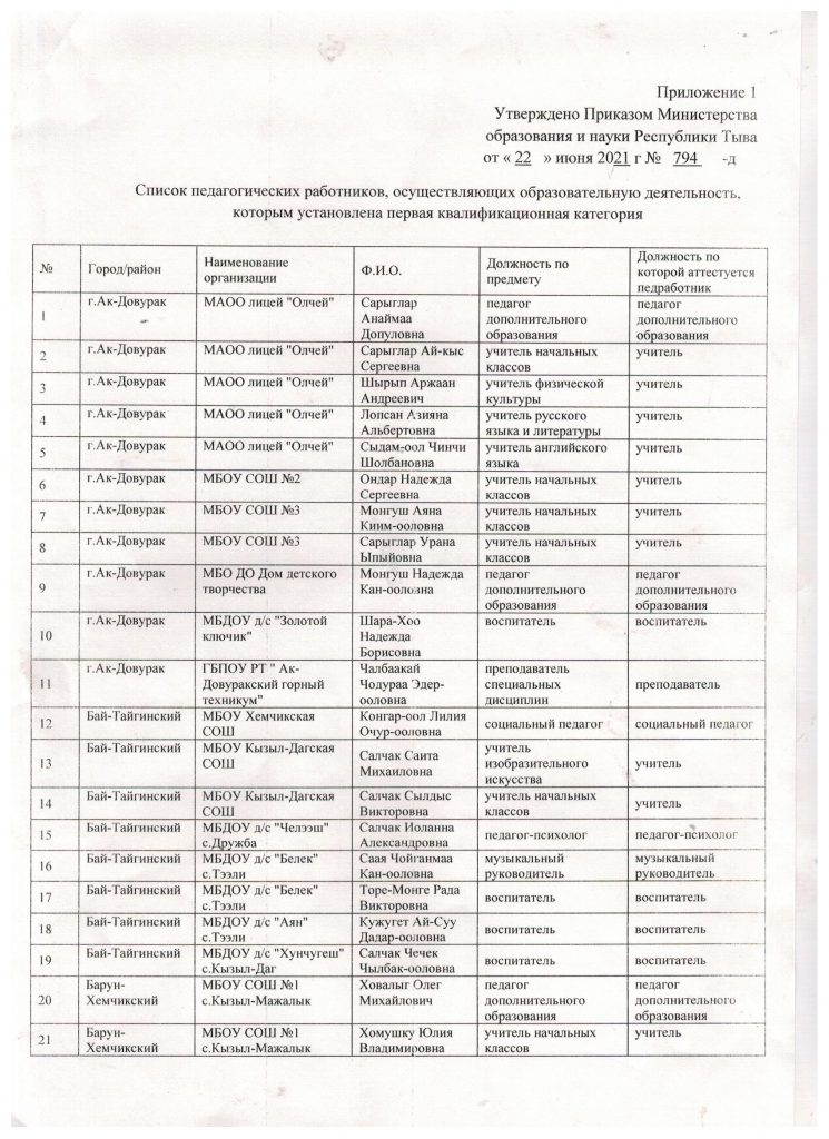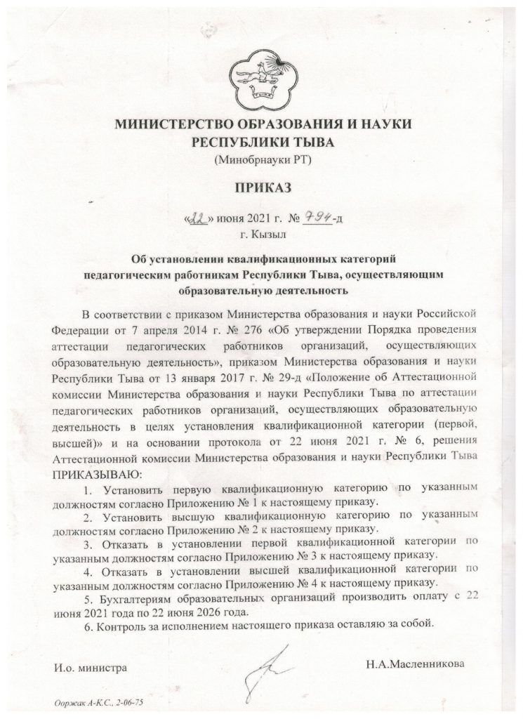 Квалификационная категория: Приказ № 794-д 2021 год.
